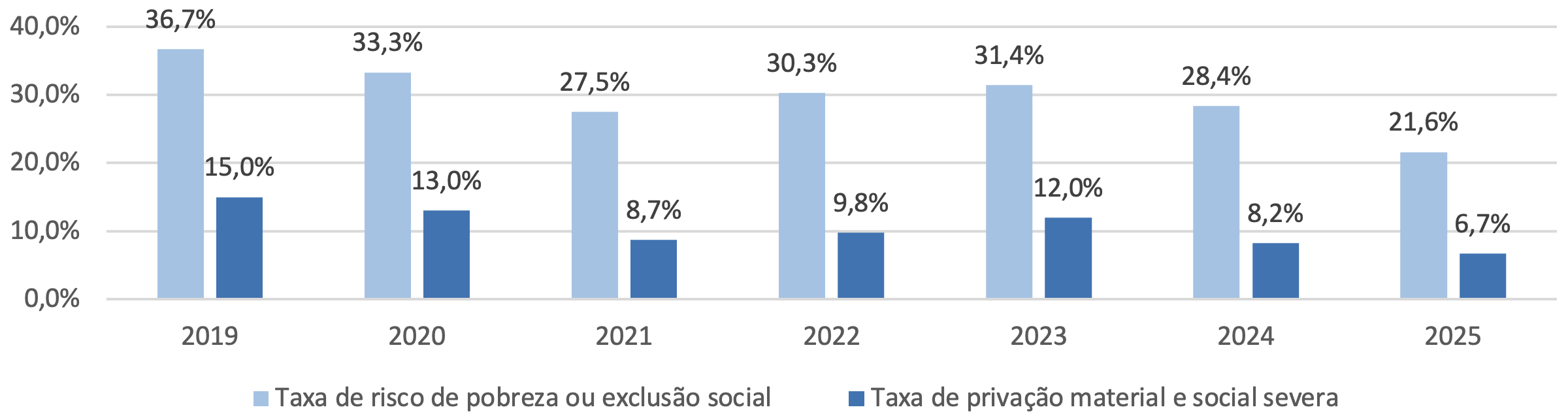 Em 2025 (rendimentos de 2024), 21,6% das pessoas estavam em risco de pobreza ou exclusão social (País: 18,6%), menos 6,8 p.p. do que em 2024.
