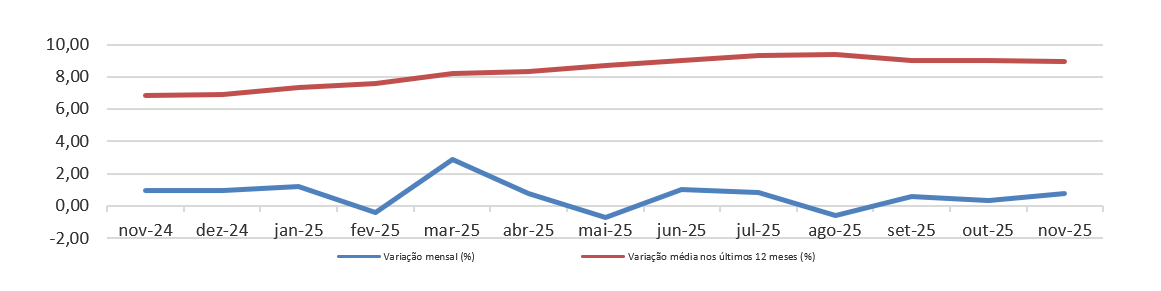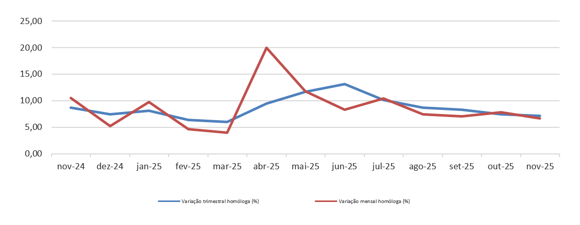 A preços constantes (corrigidos dos efeitos calendário e sazonalidade, deflacionados), verificou-se um acréscimo de 8,97% relativamente à variação média nos últimos 12 meses e um acréscimo de 0,80% em relação à variação mensal.