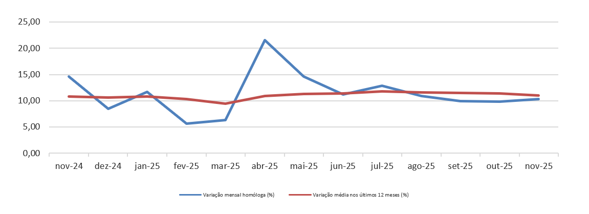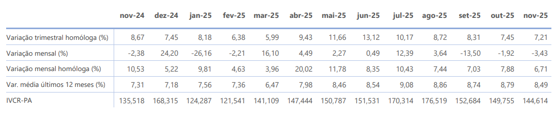A variação mensal homóloga do IVCR-PA, a preços correntes (valores brutos), apresentou uma variação positiva de 10,37%, e a variação média nos últimos 12 meses um acréscimo de 11,07%.
