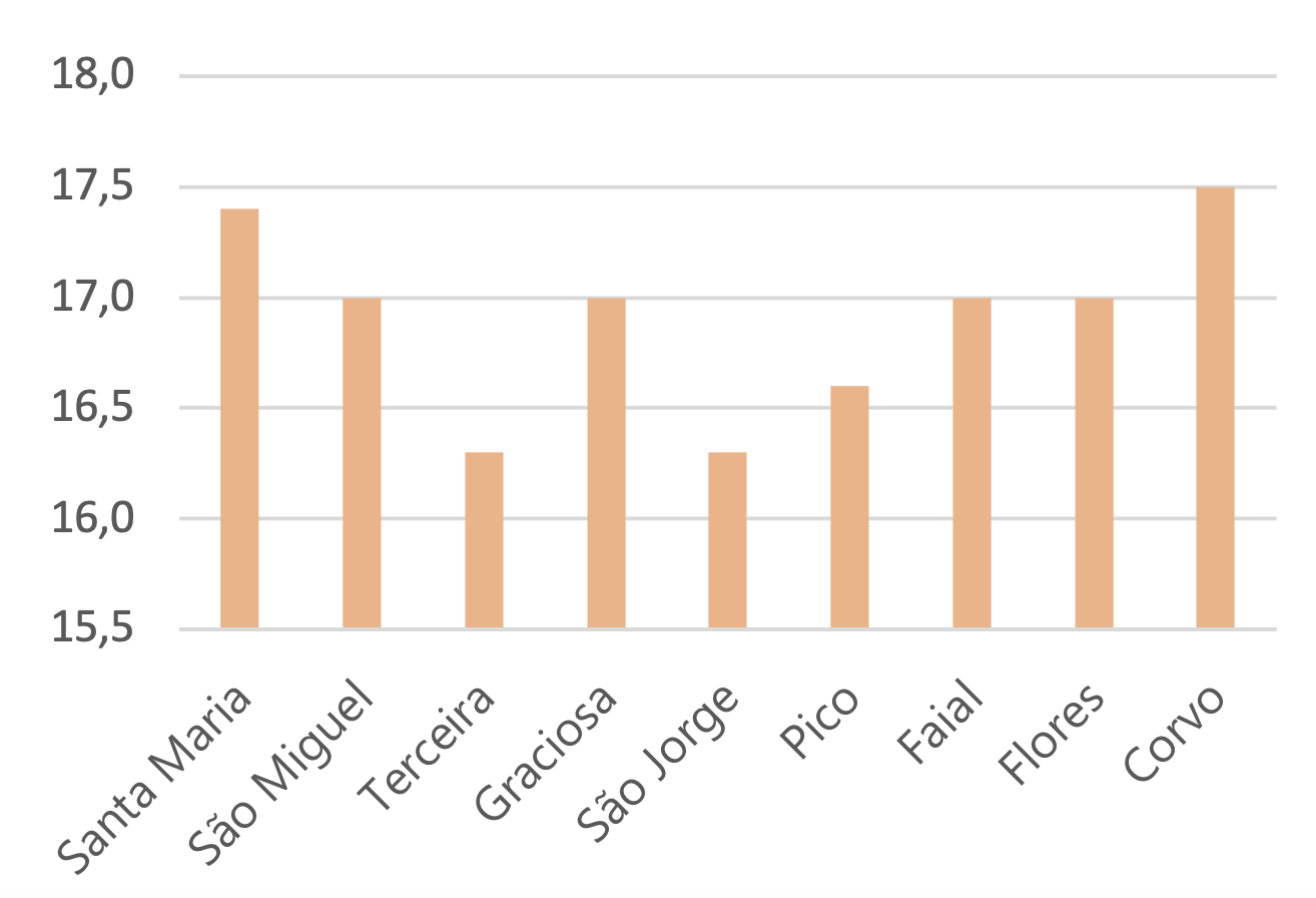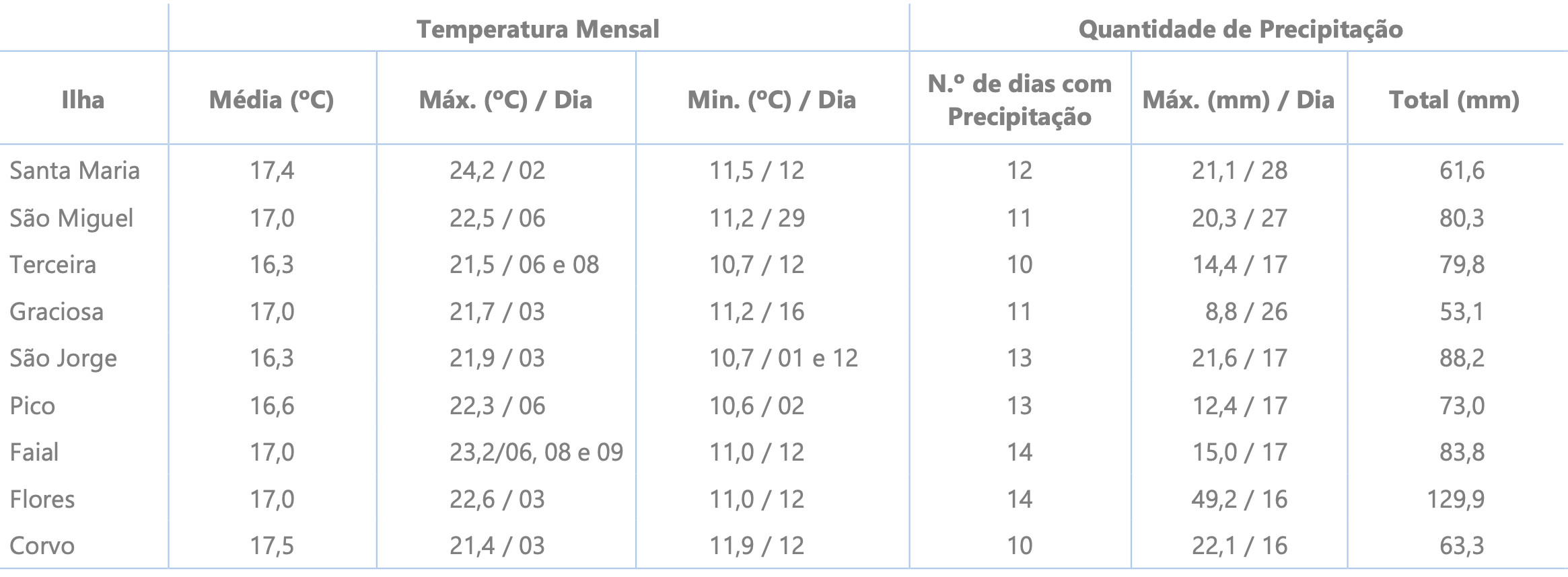 O valor da temperatura média do ar variou entre 16,3 ºC nas ilhas Terceira e São Jorge, e 17,5 ºC na ilha do Corvo; a temperatura mínima mais baixa foi 10,6 ºC, na ilha do Pico, e a máxima mais elevada foi 24,2 ºC, na ilha de Santa Maria.