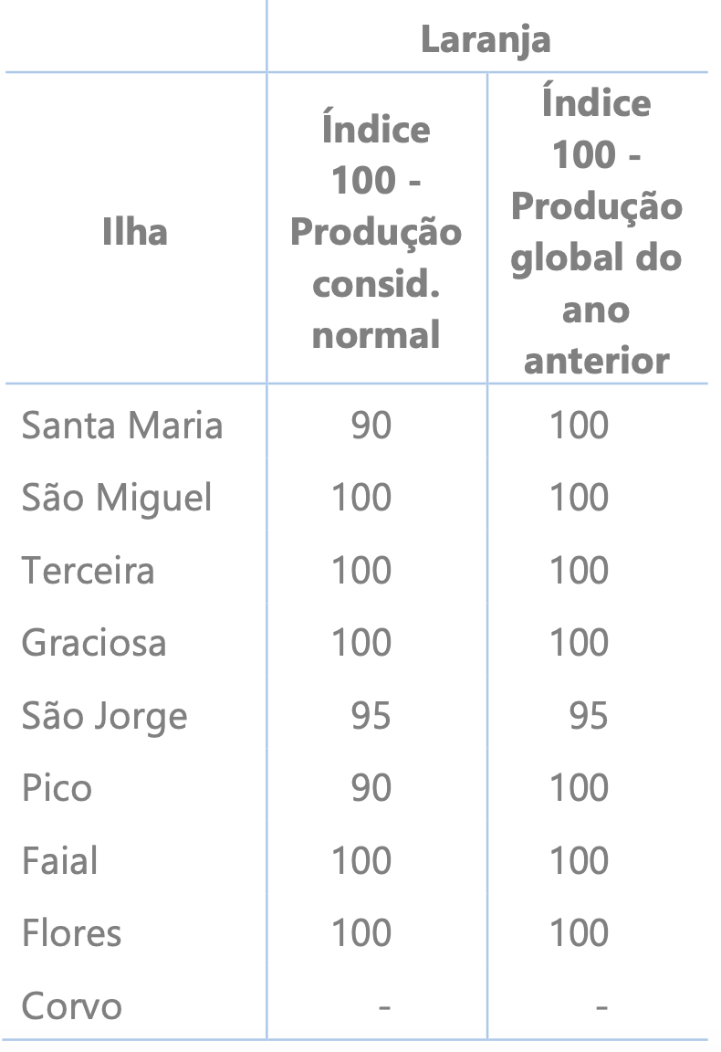As laranjeiras apresentam, no geral, um aspeto vegetativo e uma frutificação satisfatórios, não se verificando ocorrência de problemas fitossanitários significativos. No entanto, a maturação das laranjeiras encontra-se mais atrasada nas ilhas Santa Maria e Pico.