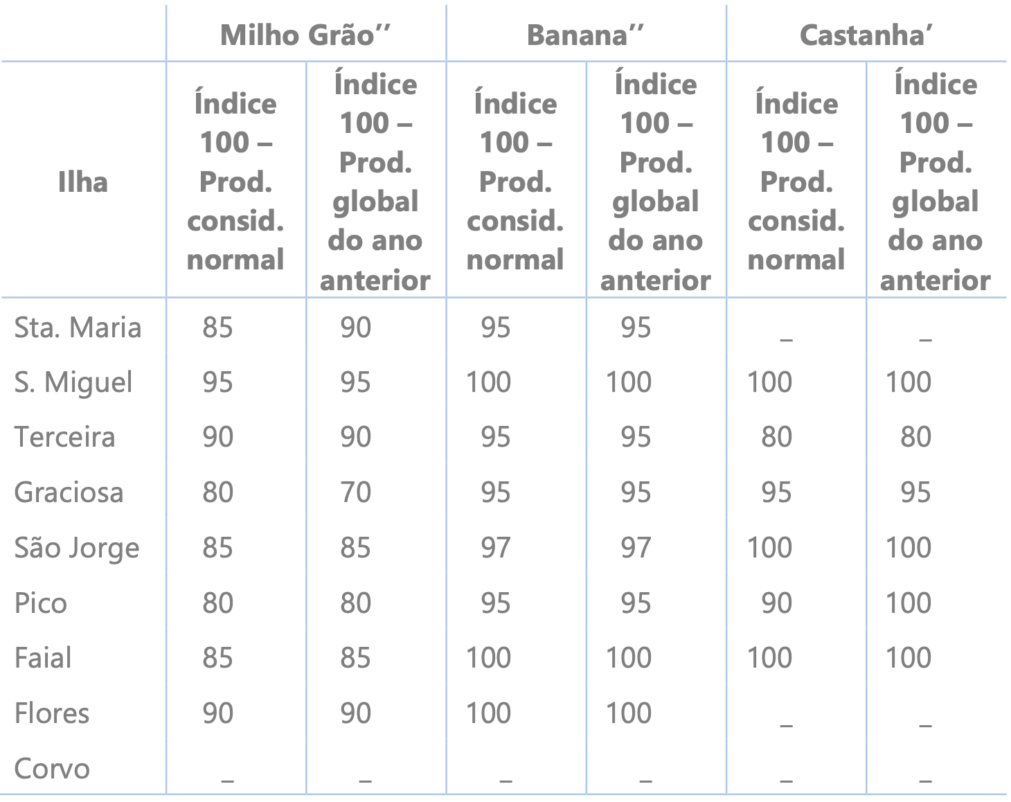 Índice 100 – Produção global do ano anterior: um valor menor, igual ou maior que 100 significa uma produção inferior, semelhante ou superior, respetivamente, à do ano anterior.
