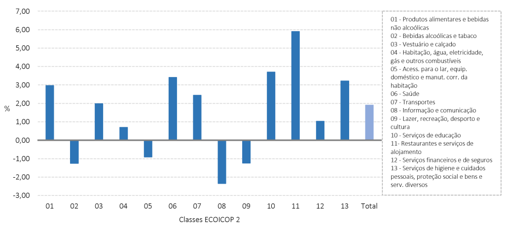 As maiores variações homólogas positivas por classes ECOICOP 2 verificaram-se na classe 11 “Restaurantes e serviços de alojamento” (5,89%), classe 10 “Serviços de educação” (3,70%) e classe 6 “Saúde” (3,40%). Em sentido contrário, as maiores variações homólogas negativas ocorreram na classe 8 “Informação e comunicação” (-2,35%), classe 2 “Bebidas alcoólicas e tabaco” (‑1,25%) e classe 9 “Lazer, recreação, desporto e cultura” (‑1,24%).