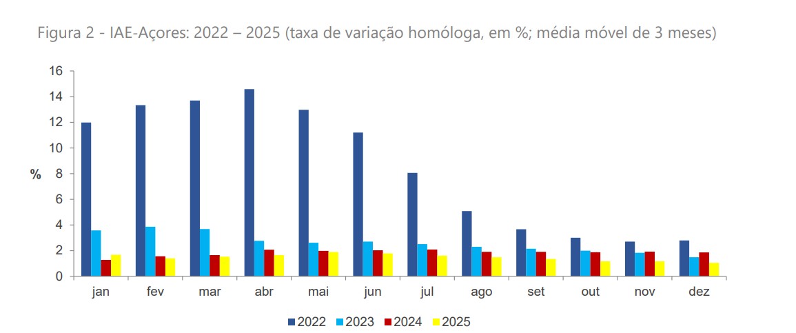 No mês de dezembro de 2025 o Indicador de Atividade Económica para os Açores (IAE-Açores) apresentou um aumento de 1,0% face ao mês homólogo do ano anterior. Este valor é ligeiramente inferior ao registado no mês anterior, verificando-se uma diminuição de 0,2 pontos percentuais.