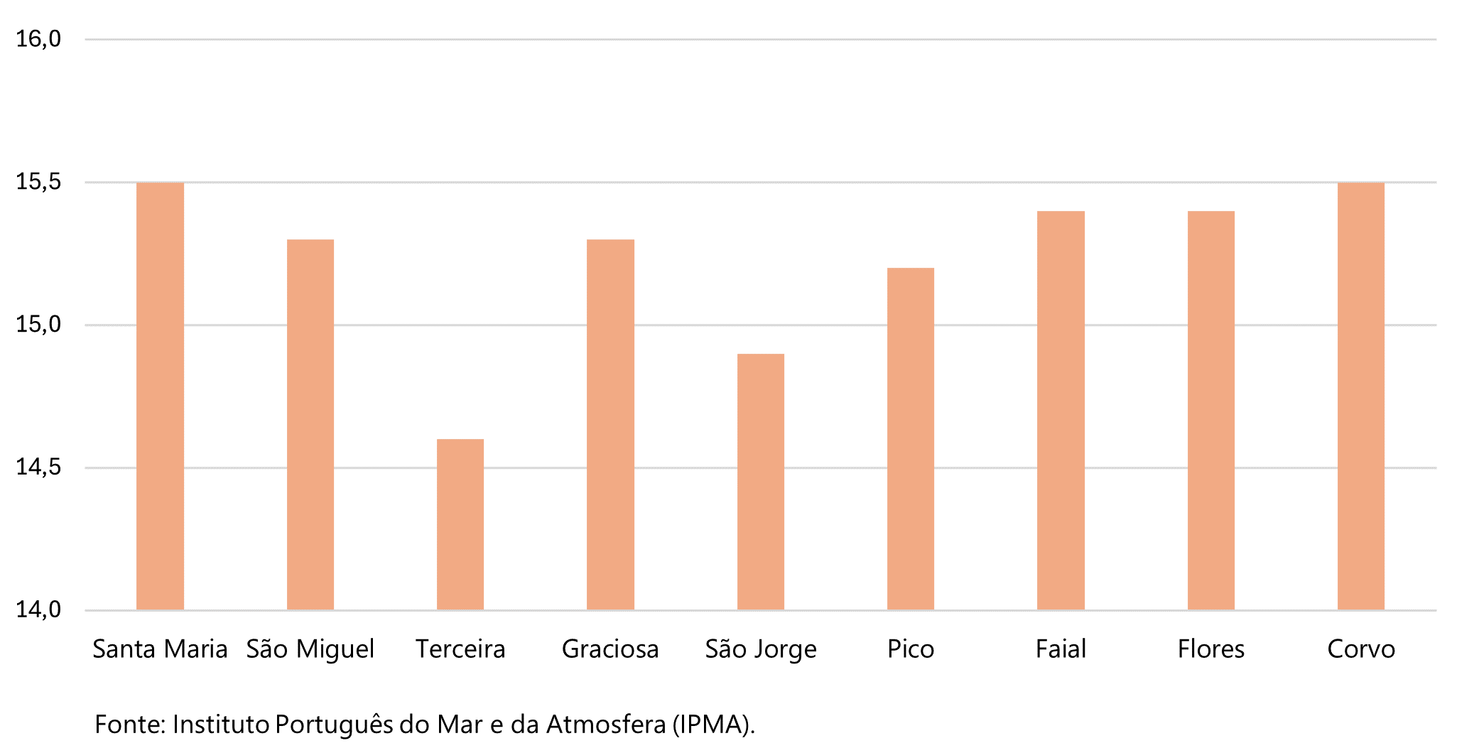 O valor da temperatura média do ar variou entre 14,6 ºC na ilha Terceira e 15,5 ºC nas ilhas Santa Maria e Corvo; a temperatura mínima mais baixa foi 6,7 ºC, na ilha do Corvo, e a máxima mais elevada foi 20,0 ºC, na ilha das Flores.