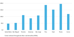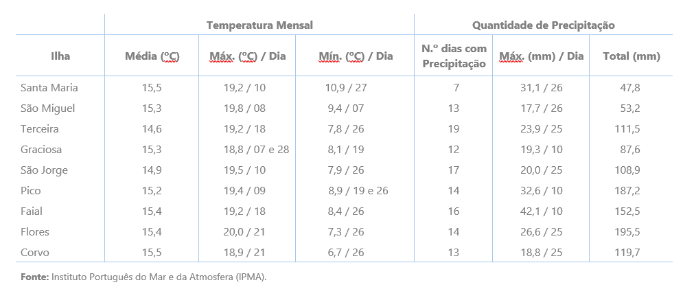 Quanto à precipitação, o valor mais elevado dos totais mensais foi registado na ilha das Flores (195,5 mm) e o valor mais baixo na ilha de Santa Maria (47,8 mm).
