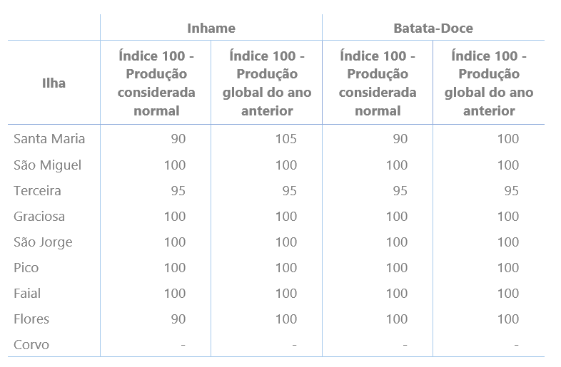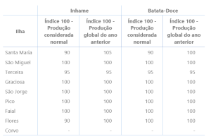 Comparativamente ao ano anterior, espera-se que a produção global de inhame seja superior na ilha de Santa Maria e inferior na ilha Terceira, prevendo-se nas restantes ilhas uma produção semelhante à obtida no ano passado. Para a batata-doce espera-se uma produção semelhante à obtida no ano passado em todas as ilhas, embora ligeiramente inferior na ilha Terceira.