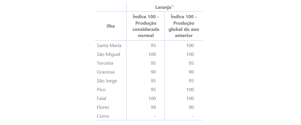 A produção de laranja (2.ª estimativa) foi um pouco inferior à inicialmente prevista, devido ao vento forte que provocou a queda de frutos, além de partir ramos de árvores e abrigos. Embora nas ilhas São Miguel e Faial, a produção se tenha mantido dentro dos parâmetros habituais, nas restantes ilhas registou‑se uma ligeira quebra, mais acentuada nas ilhas Graciosa e Flores.