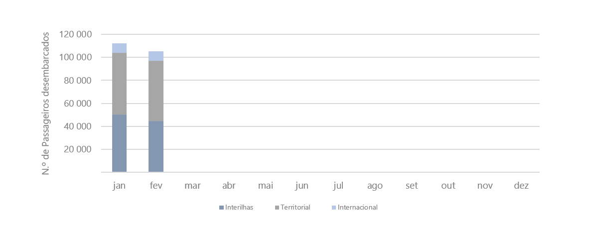 Nos aeroportos dos Açores, em fevereiro, os passageiros desembarcados verificaram-se com maior intensidade em voos territoriais (49,9% do total de passageiros desembarcados), seguindo-se os desembarcados em voos interilhas (42,2%) e os desembarcados em voos internacionais (7,9%).