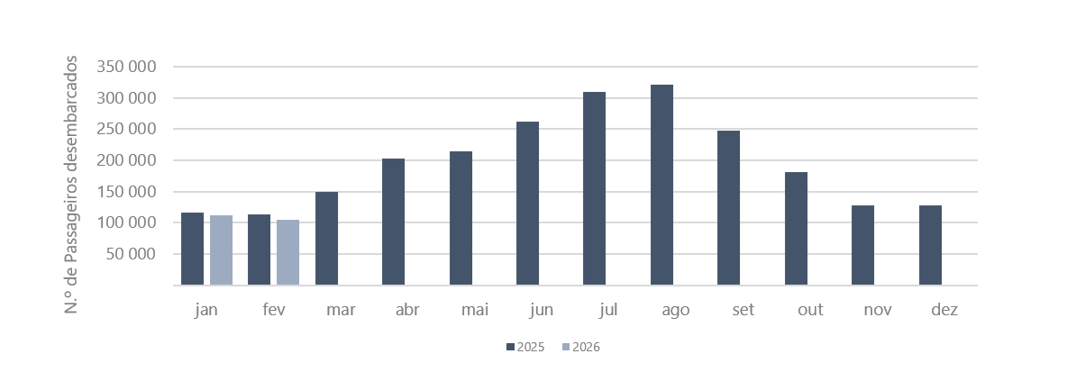 No mês de fevereiro de 2026 desembarcaram 105 276 passageiros nos aeroportos dos Açores, verificando‑se um decréscimo homólogo de 7,3%. Nos voos territoriais desembarcaram 52 491 passageiros (decréscimo homólogo de 4,0%), nos voos interilhas 44 472 passageiros (decréscimo homólogo de 6,4%) e nos voos internacionais 8 313 passageiros (decréscimo homólogo de 27,3%).