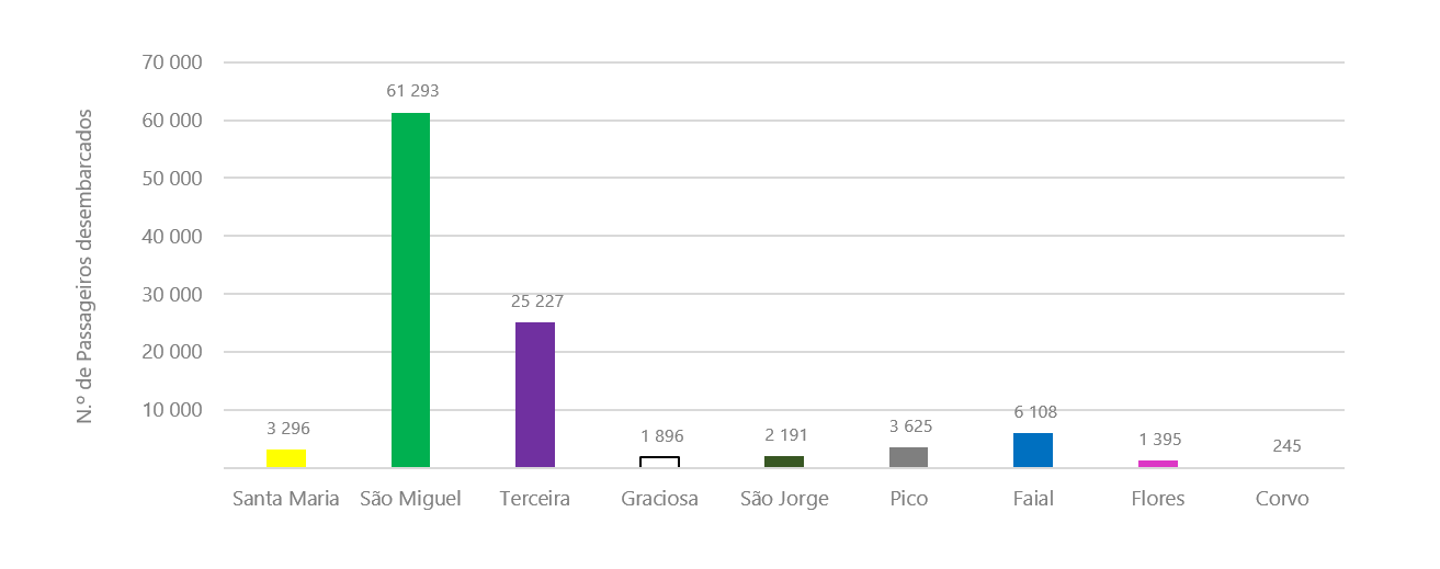 Neste mês, a ilha de São Miguel, com 61 293 passageiros desembarcados, concentrou 58,2% do total de passageiros desembarcados nos aeroportos dos Açores, seguindo-se as ilhas Terceira, com 25 227 (24,0% do total), Faial, com 6 108 (5,8% do total) e Pico, com 3 625 (3,4% do total).