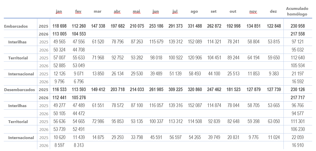 Em fevereiro de 2026 desembarcaram nos aeroportos dos Açores 105 276 passageiros, verificando-se uma variação negativa de 7,3% em relação ao mesmo mês do ano anterior.