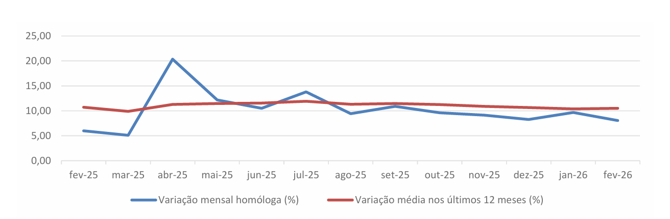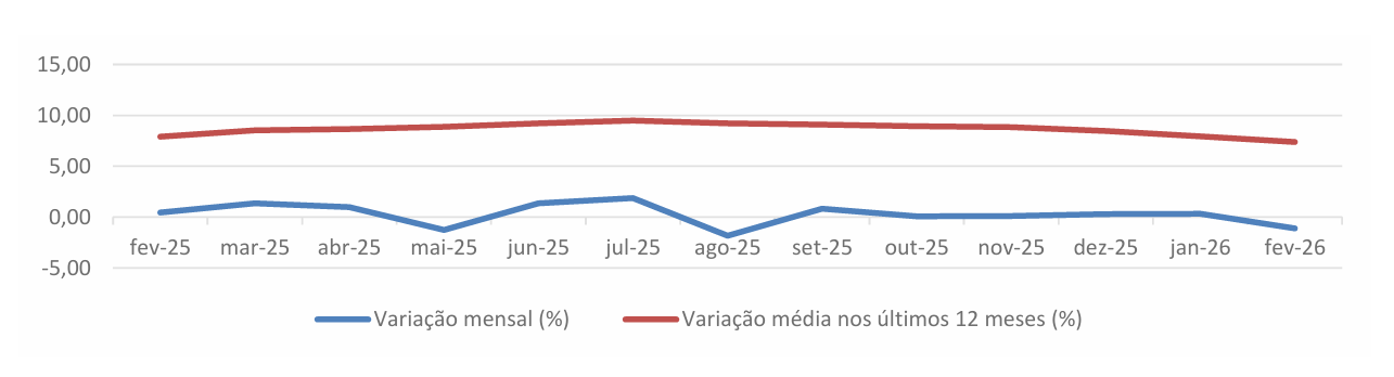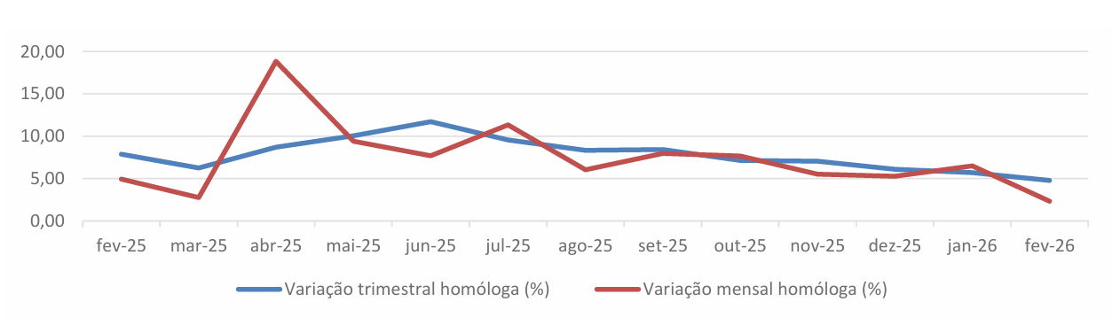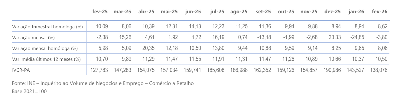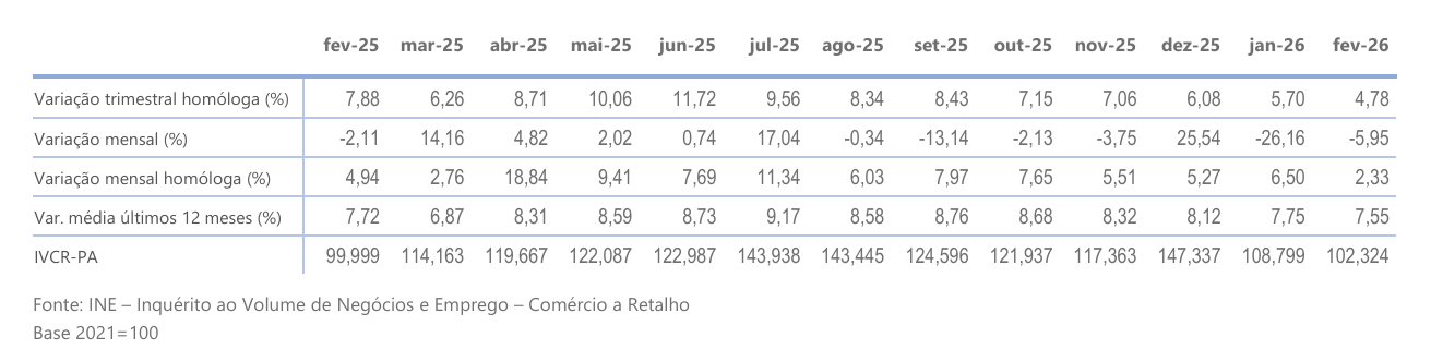 Em fevereiro, registou-se, para o IVCR-PA a preços correntes (valores brutos), uma variação mensal homóloga positiva de 8,06% e uma variação média nos últimos 12 meses positiva de 10,50%.