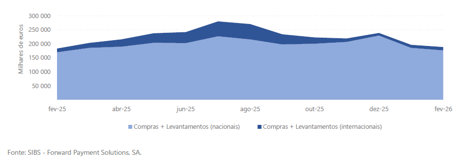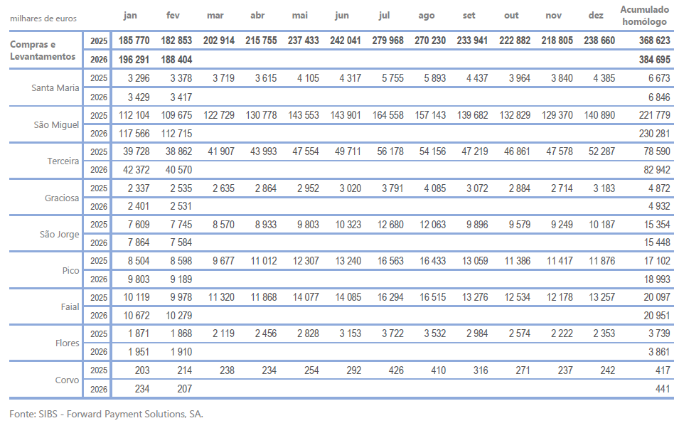 Em fevereiro de 2026, o conjunto das compras em TPA e levantamentos em CA, realizadas nos Açores, totalizaram aproximadamente 188,4 milhões de euros, registando-se uma variação homóloga positiva de 3,0%.