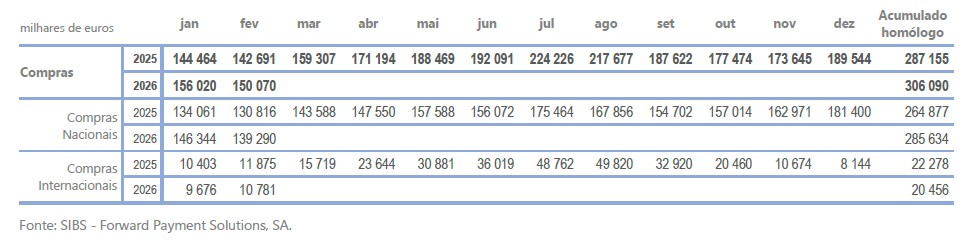 As compras realizadas por intermédio de cartões bancários em TPA atingiram em fevereiro de 2026, nos Açores, aproximadamente 150,1 milhões de euros, a que corresponde um acréscimo homólogo de 5,2%. Destes, cerca de 139,3 milhões de euros foram de compras efetuadas com cartões de bancos nacionais, o que representa uma variação homóloga positiva de 6,5%, e cerca de 10,8 milhões de euros dizem respeito a compras efetuadas com cartões de bancos internacionais, o que traduz uma diminuição homóloga de 9,2%.