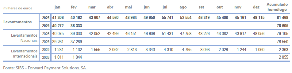 Adicionalmente, em fevereiro de 2026, os pagamentos de serviços em CA totalizaram cerca de 7,6 milhões de euros, apresentando um decréscimo homólogo de 9,5%.
