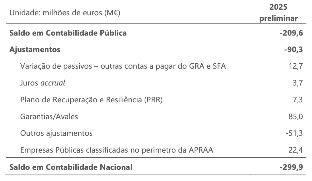 O saldo da APRAA em Contabilidade Nacional, em 2025, foi deficitário em 299,9 milhões de euros, resultante de um saldo negativo em Contabilidade Pública (-209,6 M€) ao qual se somou outro saldo negativo referente ao conjunto dos ajustamentos (‑90,3 M€).