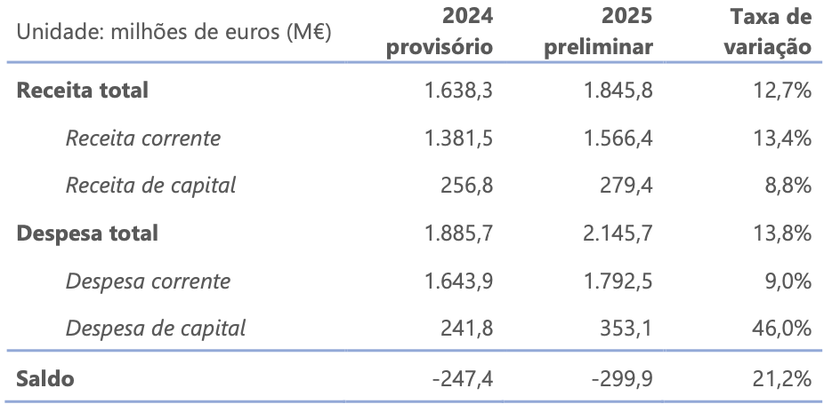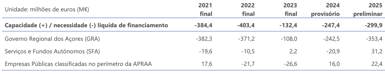 Em 2025, o défice da APRAA situou-se em -299,9 M€ (resultados preliminares), apresentando um agravamento de 52,5 M€ relativamente a 2024 (resultados provisórios). Em particular, comparativamente com o ano anterior, embora tenha havido, em Contabilidade Nacional, uma melhoria no saldo dos Serviços e Fundos Autónomos e no saldo das Empresas Públicas classificadas no perímetro da APRAA (+58,5 M€ no conjunto destes subsectores), esta melhoria foi insuficiente para compensar o agravamento do saldo do Governo Regional dos Açores (-110,9 M€).