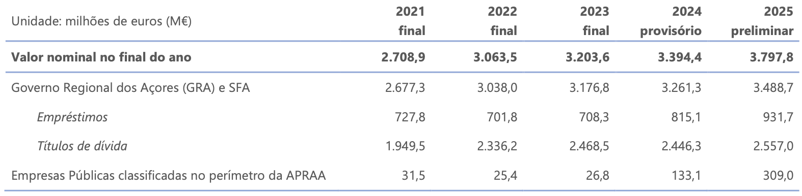 O Quadro 4 apresenta a dívida bruta da Administração Pública da Região Autónoma dos Açores (consolidada), que se situou no valor global de 3.797,8 M€ (valor preliminar) no final de 2025.
