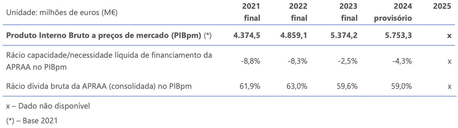 No último ano (2024) em que existe informação disponível (resultados provisórios) do Produto Interno Bruto a preços de mercado (PIBpm), o rácio da capacidade/necessidade de financiamento face ao PIBpm foi de ‑4,3% e o peso da dívida bruta da APRAA (consolidada) no PIBpm situou-se em 59,0% (cf. Quadro 5).
