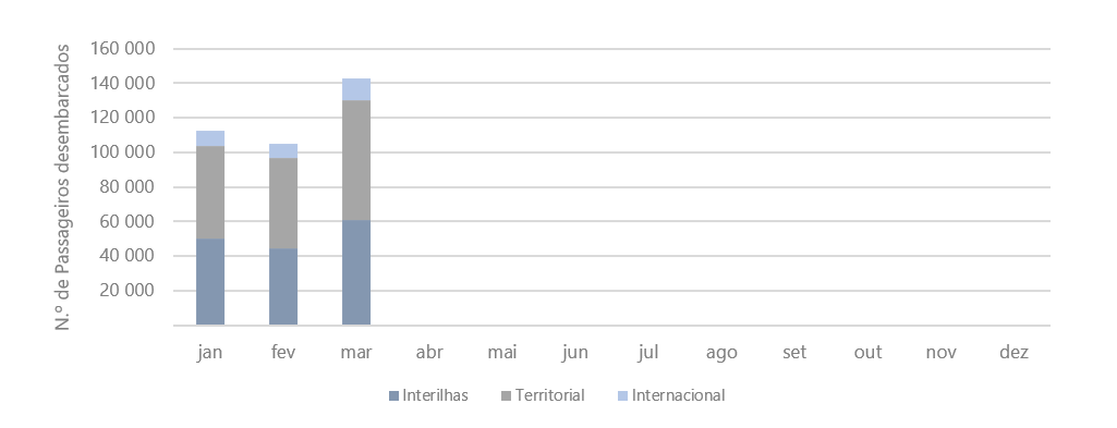 Em março, quatro ilhas apresentaram variações homólogas mensais positivas no número de passageiros desembarcados: Flores (+14,1%), Santa Maria (+7,0%), Corvo (+3,1%) e Graciosa (+2,2%). Em sentido inverso, as restantes ilhas registaram variações homólogas negativas: São Jorge (-11,0%), Terceira (-7,4%), Faial (-6,6%), São Miguel (-3,9%) e Pico (-3,3%).
