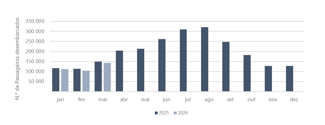 No primeiro trimestre de 2026 desembarcaram 360 539 passageiros nos aeroportos dos Açores, menos 19 329 passageiros do que no período homólogo, verificando-se um decréscimo de 5,1% face ao mesmo período do ano anterior.