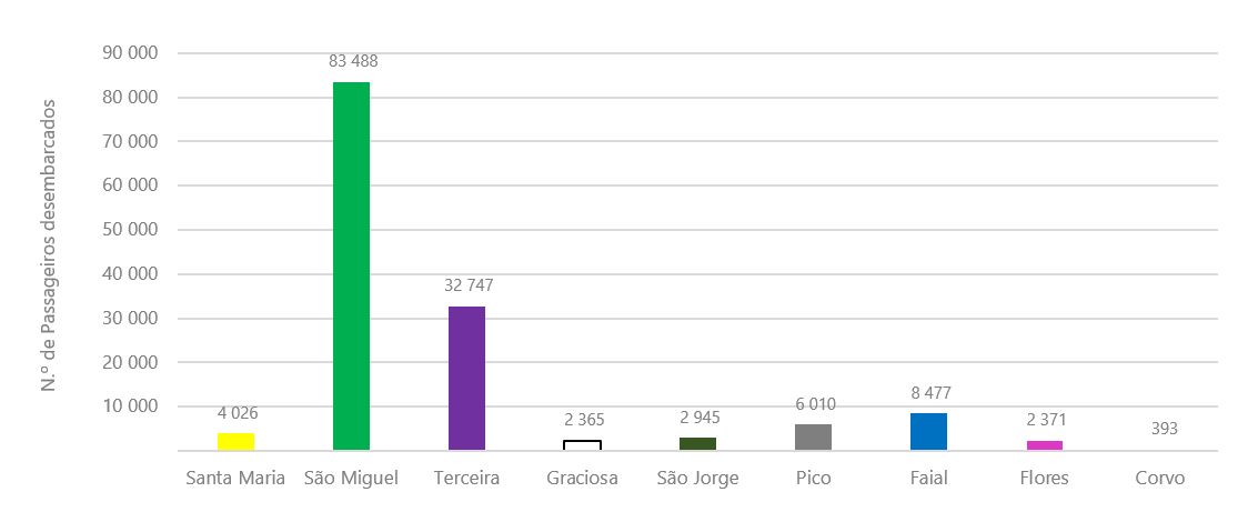 Neste mês, a ilha de São Miguel, com 83 488 passageiros desembarcados nos aeroportos dos Açores, concentrou 58,5% do total de desembarcados na Região, seguindo-se as ilhas Terceira, com 32 747 (22,9%), Faial, com 8 477 (5,9%) e Pico, com 6 010 (4,2%).