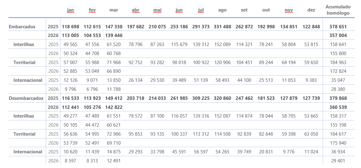 No mês de março de 2026 desembarcaram 142 822 passageiros nos aeroportos dos Açores, verificando‑se um decréscimo homólogo de 4,4%. Nos voos territoriais desembarcaram 69 710 passageiros (decréscimo homólogo de 4,5%), nos voos interilhas 60 621 passageiros (decréscimo homólogo de 1,5%) e nos voos internacionais 12 491 passageiros (decréscimo homólogo de 16,0%).