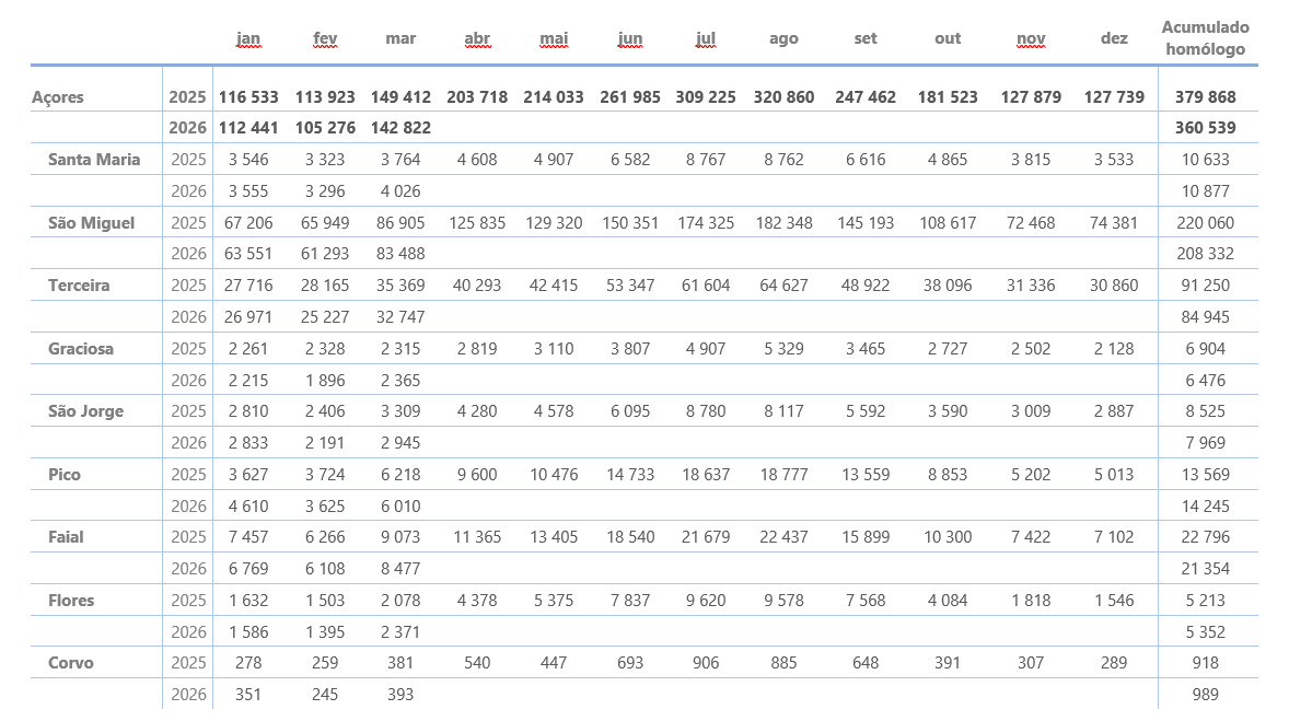 No primeiro trimestre de 2026, a variação homóloga do número de passageiros desembarcados foi positiva em quatro ilhas, com maior expressão no Corvo (+7,7%), seguindo-se o Pico (+5,0%), as Flores (+2,7%) e Santa Maria (+2,3%). Em sentido contrário, registaram-se decréscimos nas ilhas Terceira (-6,9%), São Jorge (‑6,5%), Faial (-6,3%), Graciosa (-6,2%) e São Miguel (-5,3%).