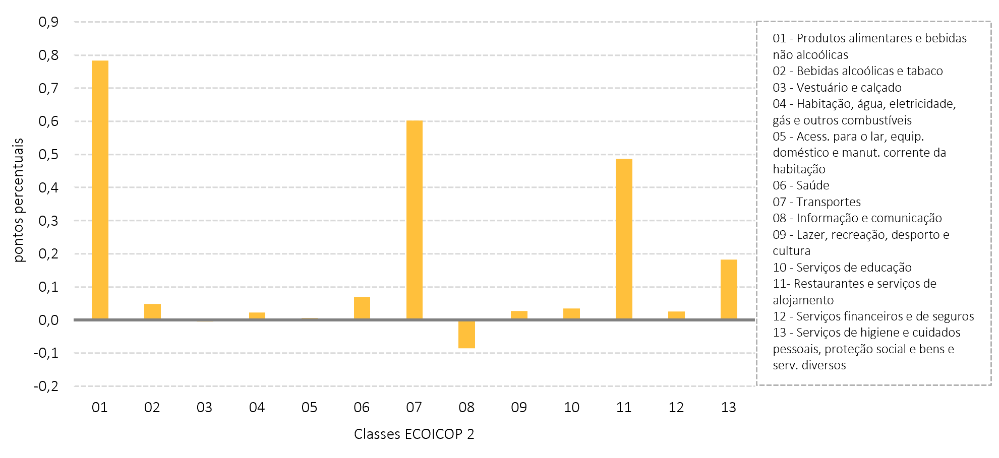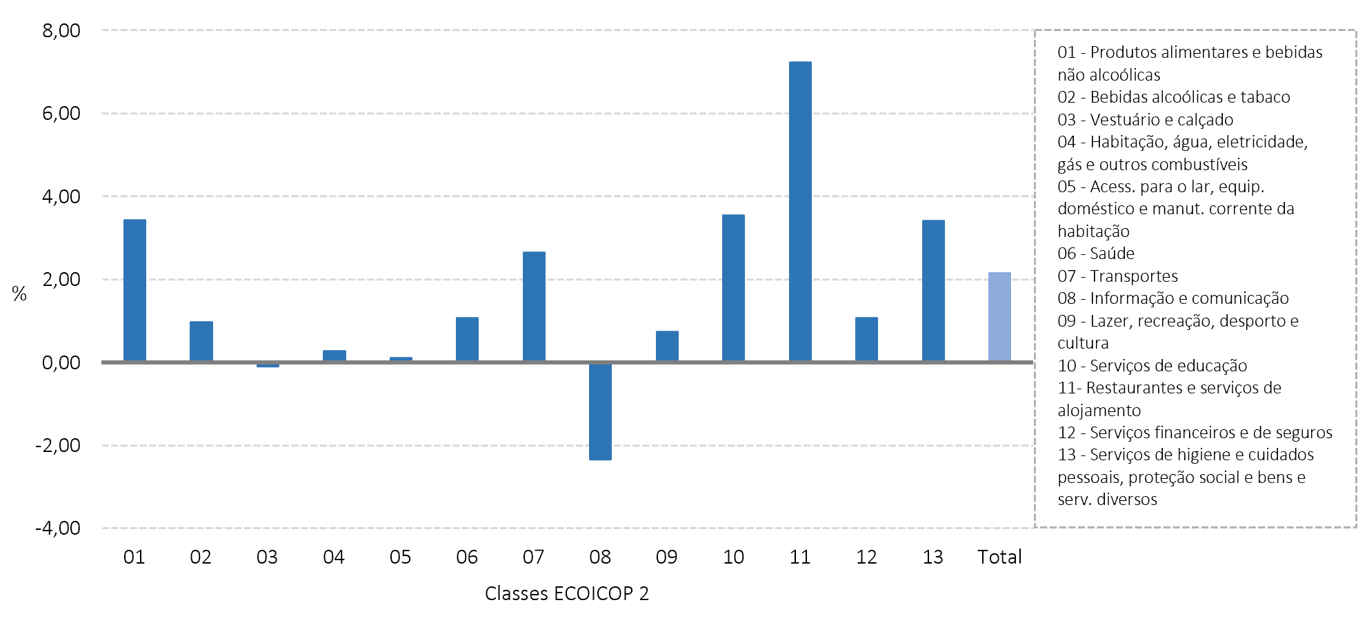 As maiores variações homólogas positivas por classes ECOICOP 2 verificaram-se na classe 11 “Restaurantes e serviços de alojamento” (7,22%), classe 10 “Serviços de educação” (3,54%) e classe 1 “Produtos alimentares e bebidas não alcoólicas” (3,43%). Em sentido contrário, as maiores variações homólogas negativas ocorreram na classe 8 “Informação e comunicação” (-2,34%) e classe 3 “Vestuário e calçado” (‑0,10%).