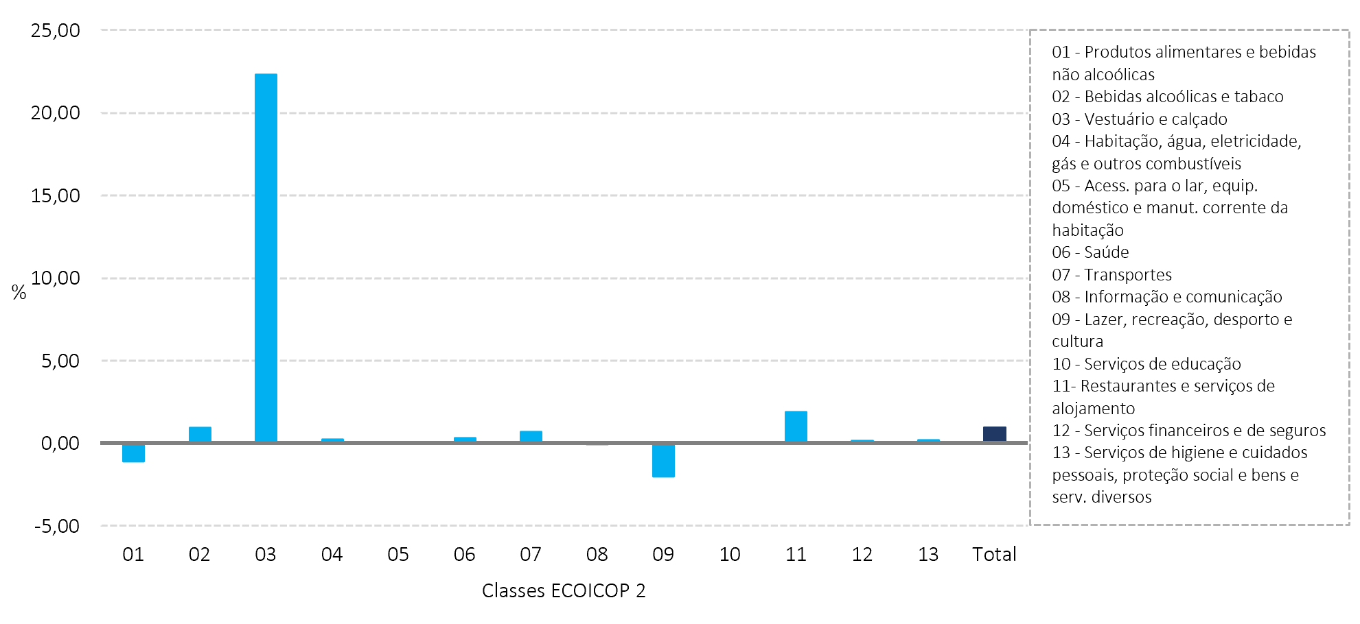 Para a taxa de variação mensal concorreram, de forma mais significativa, a classe 3 “Vestuário e calçado”, positivamente (22,32%), e a classe 9 “Lazer, recreação, desporto e cultura”, negativamente (-2,03%).