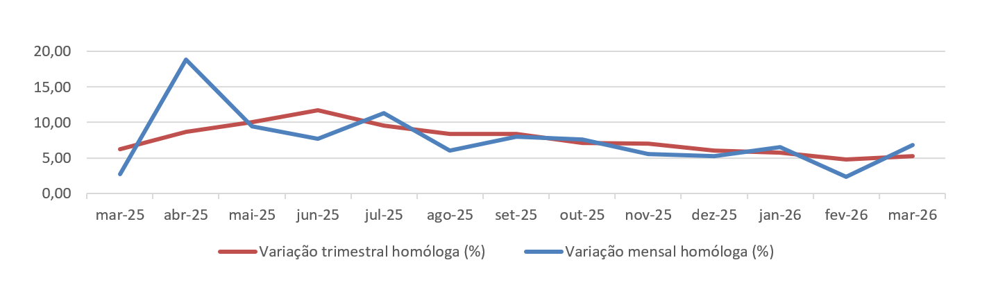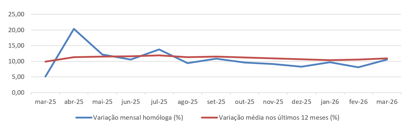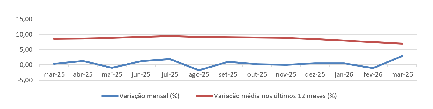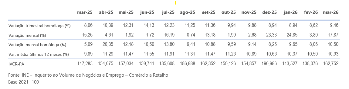 Em março, registou-se, para o IVCR-PA a preços correntes (valores brutos), uma variação mensal homóloga positiva de 10,50% e uma variação média nos últimos 12 meses positiva de 10,93%.