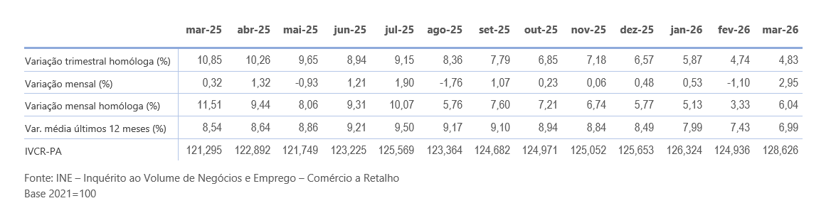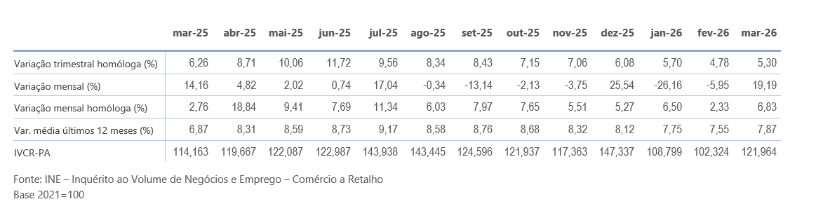 O índice de vendas do comércio a retalho de produtos alimentares (IVCR-PA) registou em março, a preços constantes (valores brutos, deflacionados), uma variação mensal homóloga positiva de 6,83% e uma variação trimestral homóloga positiva de 5,30%.