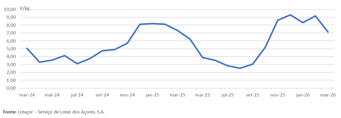 A ilha das Flores, em março, apresentou o preço médio do pescado descarregado mais elevado (13,56 €/kg), valor consideravelmente superior à média regional (7,13 €/kg), seguindo-se as ilhas Graciosa (12,48 €/kg), Corvo (11,81 €/kg), São Jorge (11,25 €/kg), Faial (10,90 €/kg), Terceira (9,05 €/kg), Pico (7,11 €/kg), Santa Maria (6,35 €/kg) e São Miguel (5,75 €/kg).