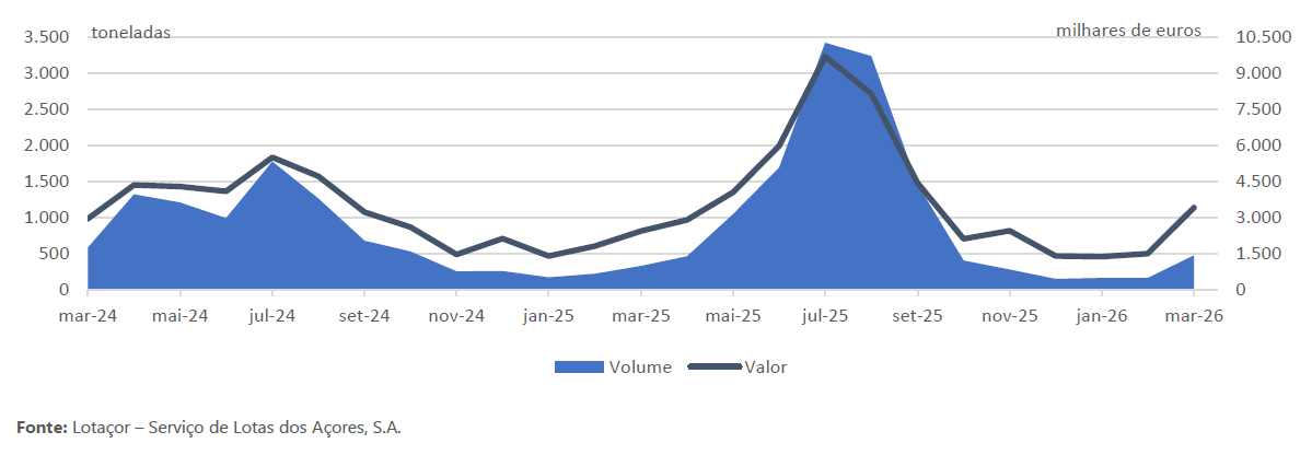 No mês de março de 2026, nos Açores, foram descarregadas em lota 480,5 toneladas de pescado (não inclui pescado rejeitado nem caldeirada, nem algas não destinadas a consumo humano) com um valor total de 3,4 milhões de euros.