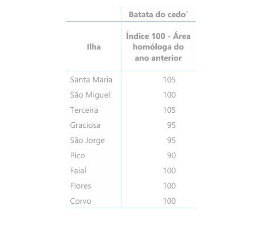 Em relação à área cultivada com batata do cedo, prevê-se, numa primeira estimativa, que esta seja ligeiramente inferior à do ano anterior nas ilhas Pico, Graciosa e São Jorge, devido, essencialmente, às condições meteorológicas, mas também a alguma desmotivação dos produtores, associada à falta de mão de obra. Pelo contrário, nas ilhas Santa Maria e Terceira, espera-se um ligeiro aumento da área cultivada da batata do cedo face ao ano anterior, enquanto nas restantes ilhas se estima que a área permaneça sensivelmente idêntica à cultivada no ano anterior.