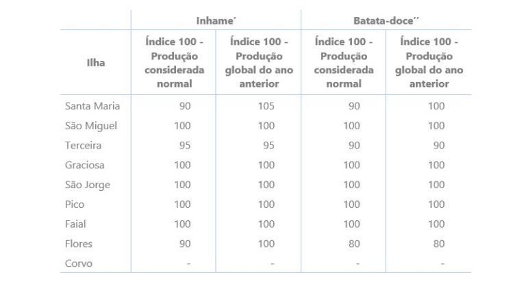 Quanto à colheita da batata-doce, confirmam-se as estimativas do mês anterior, com uma produção dentro do considerado normal em quase todas as ilhas, com exceção das ilhas Flores, Santa Maria e Terceira, sendo que, na ilha das Flores, a produção se mantém em cerca de 80% da obtida num ano considerado padrão. Embora esta cultura não seja particularmente sensível às condições meteorológicas, denota-se, face à primeira estimativa, uma ligeira diminuição na produção na ilha Terceira, em particular devido ao frio e à elevada pluviosidade ocorrida no mês anterior. Comparativamente ao ano anterior, a produção global foi idêntica em todas as ilhas, com exceção das ilhas Flores e Terceira, onde a produção global foi inferior.