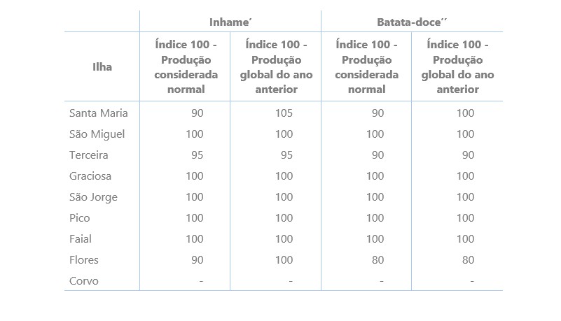 A cultura do inhame caracteriza-se por ser bastante resistente a condições adversas; contudo, as temperaturas baixas ocorridas exerceram uma influência negativa na sua produção normal, sobretudo nas ilhas Flores, Santa Maria e Terceira, as quais registaram uma produção ligeiramente inferior à considerada habitual. Comparativamente com o ano anterior, a produção global foi semelhante em quase todas as lhas, com exceção de Santa Maria, onde foi ligeiramente superior, e da Terceira, onde ficou um pouco abaixo do obtido no ano anterior.