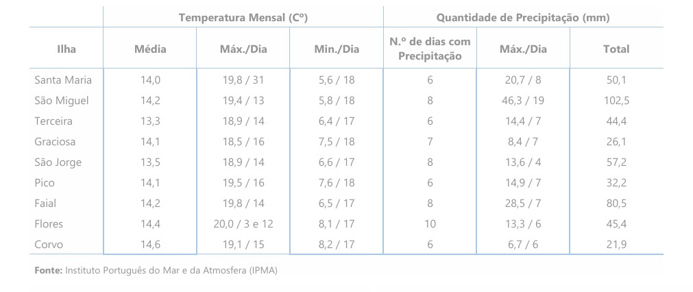 Quanto à precipitação, o valor mais elevado dos totais mensais foi registado na ilha de São Miguel (102,5 mm) e o valor mais baixo na ilha do Corvo (21,9 mm).